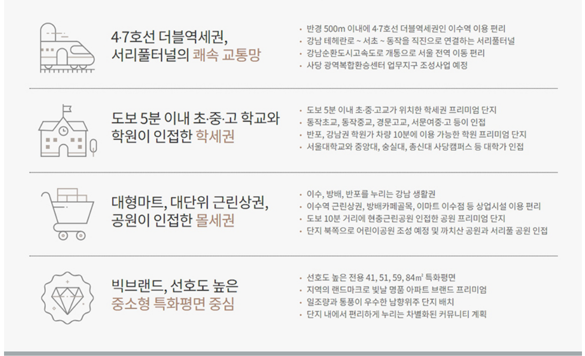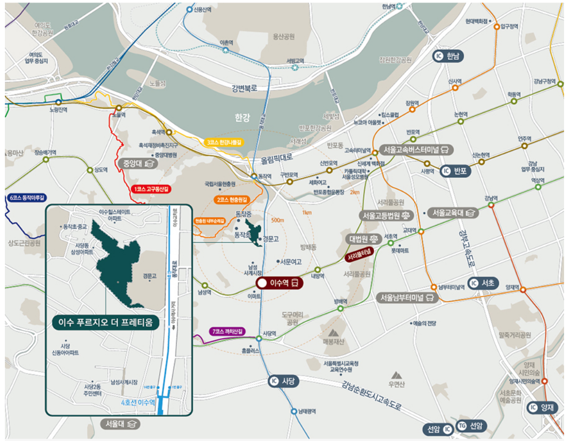 이수 푸르지오 더 프레티움은 더블 역세권에 반포와 가깝다는 장점을 가지고 있습니다